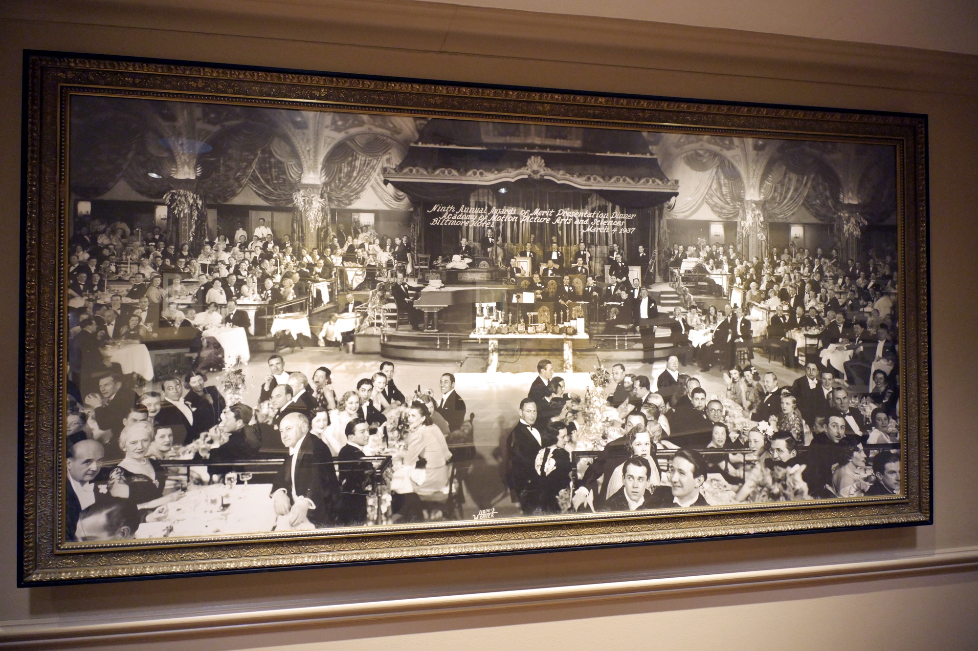 Photo of 9th Academy Awards held in 1937 at Biltmore Hotel – Cecil B Demille, Henry Fonda, Walt Disney shown at bottom left, center and right
